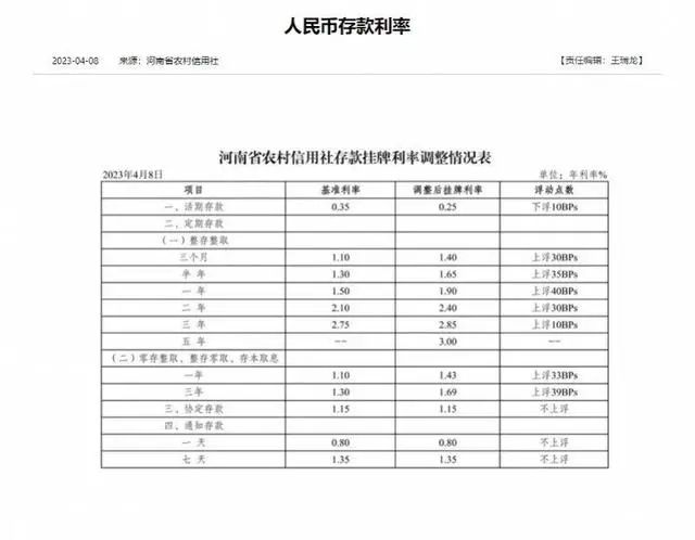 4月8日,河南省農(nóng)村信用社發(fā)布關(guān)于調(diào)整人民幣存款利率的公告顯示,自4月8日起,活期存款掛牌利率為0.25%,將一年期、兩年期、三年期整存整取定期存款掛牌利率分別調(diào)整至1.9%、2.4%、2.85%。